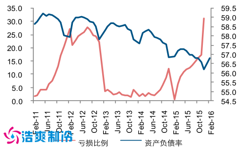 我國工業(yè)企業(yè)的虧損比例和資產(chǎn)負載率(%)