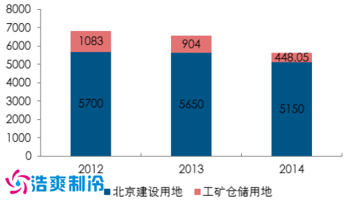 全國建設用地中工礦倉儲用地占比持續(xù)減少,2015 年比例為負,這一特點在大型城市更加突出。以北京為例,北京市國有建設用地供應計劃總量在近 3 年年的數(shù)量分別為 5700 萬平米、5650 萬平米以及 5150 萬平米,而其中,工礦倉儲用地分別則為 1100 萬平米、900 萬平米以及 450 萬平米。也就是說,工礦倉儲用地供應量占比在三年間從 19%,下降到 16%,直至 2014 年的 8.7%。