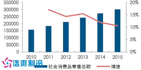 2015 年底,我國第三產(chǎn)業(yè)對 GDP 的貢獻達到 66.4% ,對 GDP 的拉動率在 4.6% 。相比工業(yè)增加值(VAI) ,我國消費總額具有明顯的增長優(yōu)勢,2015 年我國社會消費品累計總額已達到 200930 億人民幣。據(jù)預測,到 2020 年,全球消費品行業(yè)的市場規(guī)模將高達 7000 億美元,其中近五成將來自亞太地區(qū),尤其是中國、印度尼西亞、印度、新加坡和泰國市場;僅就中國市場而言,其消費品行業(yè)的市場規(guī)模預計將增長約 2千億美元,占整個亞太市場增長的 60%。