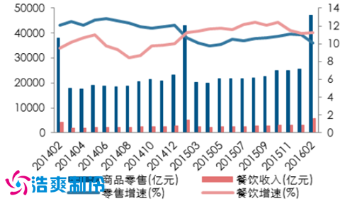 零售消費品主要分兩個部分,消費收入和餐飲收入。其中,商品收入占比較高但增長具有季節(jié)性,尤其在春節(jié)時期達到高值。相比較而言餐飲收入相對穩(wěn)定,常年增速保持在 11%左右。