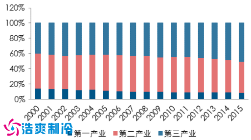 從發(fā)達國家的經(jīng)驗來看 ,到了工業(yè)化的后期, 第二產(chǎn)業(yè)占國民經(jīng)濟的比重將逐漸下降。 且第二產(chǎn)業(yè)所帶來的經(jīng)濟效益也持續(xù)降低。 同時,第三產(chǎn)業(yè)將逐步取代第二產(chǎn)業(yè)在 GDP比例中的優(yōu)勢地位。截止 2015 年末,我國第三產(chǎn)業(yè)占 GDP 比例 50%,高出第二產(chǎn)業(yè)9 個百分點。同時,我國制造業(yè)的收入增長率逐年下降,利潤增長率 2015 年處于負增長,2016 年由于國家各種改革和支持,雖然恢復到正增長,但依然維持在較低水平。此外, 我國第二產(chǎn)業(yè)的虧損企業(yè)比例 2015 年低到達了 31.3%, 而資產(chǎn)負債率震蕩下行。