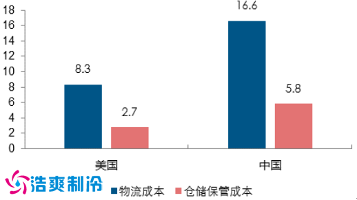 2014 年中美物流相關成本占 GDP 比例比較(%)